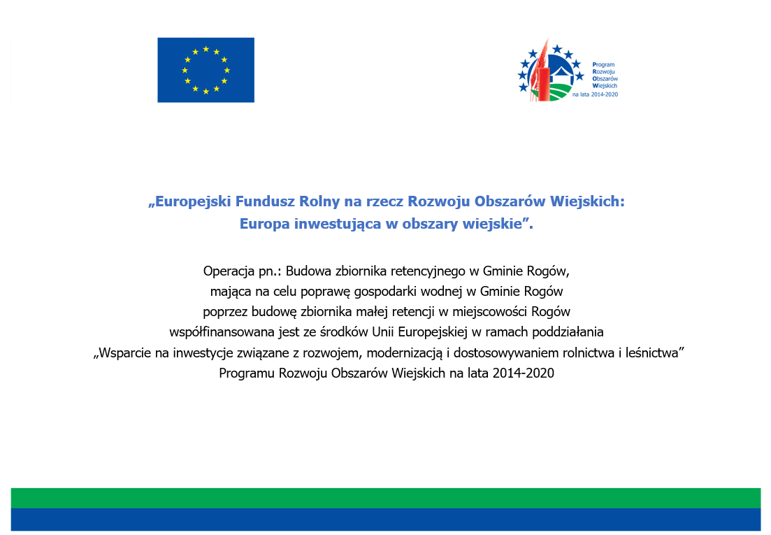 Gmina Rogów w dniu 4 kwietnia 2024 r. zawarła umowę z Samorządem Województwa Łódzkiego o przyznaniu pomocy Nr 00021-65021-UM0520030/23 na realizację operacji pn.: „Budowa zbiornika retencyjnego w Gminie Rogów”. Zbiornik zrealizowany zostanie na działce nr 75/2 przy ulicy Żeromskiego w Rogowie. Celem operacji jest poprawa gospodarki wodnej w Gminie Rogów poprzez budowę zbiornika małej retencji w miejscowości Rogów.